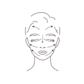 为防止触及眼睛,请从额头和脸颊较宽的区域开始,由内向外,提拉的同时均匀涂抹。