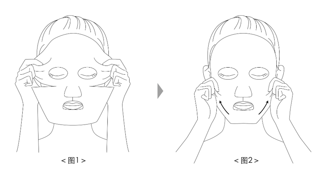 - 捏住脸颊部分的两端,就像提拉面部轮廓一样,提拉的同时使其紧贴于肌肤。(图2)